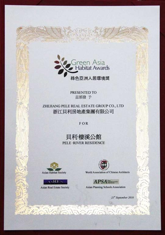 “绿色亚洲人居环境大奖”是迄今为止亚洲规模最大、级别最高的房地产奖项,是为对改善人类居住环境工作做出杰出贡献的亚洲项目给予的最高人居奖项,主旨是推动亚洲各国改善人民生活品质、改善生活环境、改善居住区域家庭住宅的生活环境以及改善城市总效率的经济型商业模式与技术。