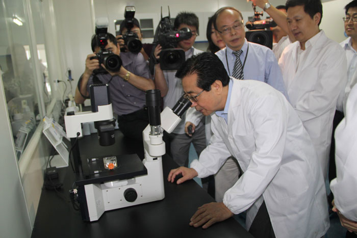赵书记一行首先参观了易文赛公司,国家“千人计划”入选者---易文赛总经理项春生教授从企业的产学研定位,企业研发中心、专家团队等平台,企业所取得的项目支持,产品开发等方面做了详尽的介绍。在实验室里,赵书记观看了技术人员的干细胞提取、储存等工艺流程,还亲自在显微镜下观察了干细胞从“种子细胞”到“功能细胞”分化的神奇过程;随后,赵书记一行来到会议室听取了关于易文赛企业未来发展规划、运营成果、成功案例等情况的汇报。