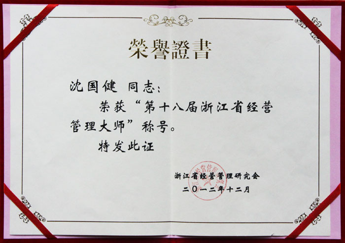 沈国健董事长荣获“第十八届浙江省经营管理大师”荣誉称号