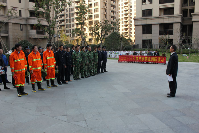 “演习开始!”——在演习总指挥的一声响亮的口令下, “2013年杭州民安物业消防演习”在栖溪公馆小区拉开了帷幕。