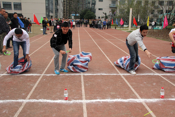 本次比赛分男女组,进行袋鼠跳、套圈和20米短跑三个环节,用时最短者获胜。随着哨声吹响,比赛开始了,运动员们把自己装在布袋中,开始一蹦一蹦地模仿袋鼠向前跳,到达终点后套中圈,然后再以最快的速度返回起点。比赛过程精彩纷呈,特别是袋鼠跳环节显得尤为激烈,趣味性十足。