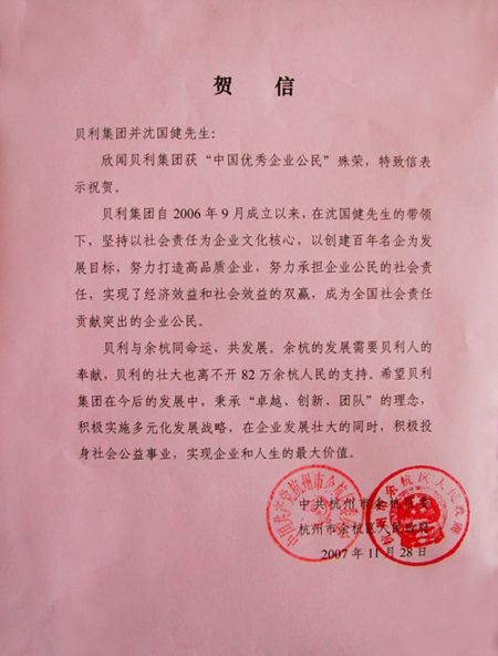 余杭区委区政府致信祝贺贝利集团荣膺“中国优秀企业公民”