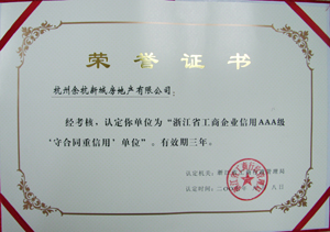 日前,浙江省工商局在《浙江日报》上公布了“浙江省工商企业信用AAA级‘守合同重信用’单位名单,新城房产获此殊荣,这是新城房产连续四年被认定“浙江省消费者信得过单位”以来,荣获的又一省级荣誉。