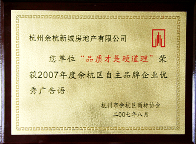 日前,在“余杭区自主品牌企业优秀广告语征集评选”活动中,新城房产的广告语“品质才是硬道理”在众多参选广告语中脱颖而出,荣获“自主品牌企业优秀广告语”。