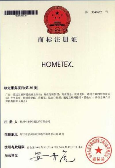 3月21日,中国家纺网收到了“HOMETEX”商标注册证,此次商标的注册成功标志着杭州贝利电子商务有限公司在知识产权保护方面迈出了新的一步。