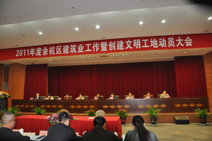 4月22日,余杭区召开建筑业工作暨创建文明工地动员大会。参加会议的有省、市、区有关领导,区级机关各有关部门、各镇乡(街道、管委会)的分管负责人,全区建筑业各施工、监理、检测、招标代理、造价咨询等企业法人代表及部分注册建造师等合计400余人。会议由建设局副局长李柏林主持。