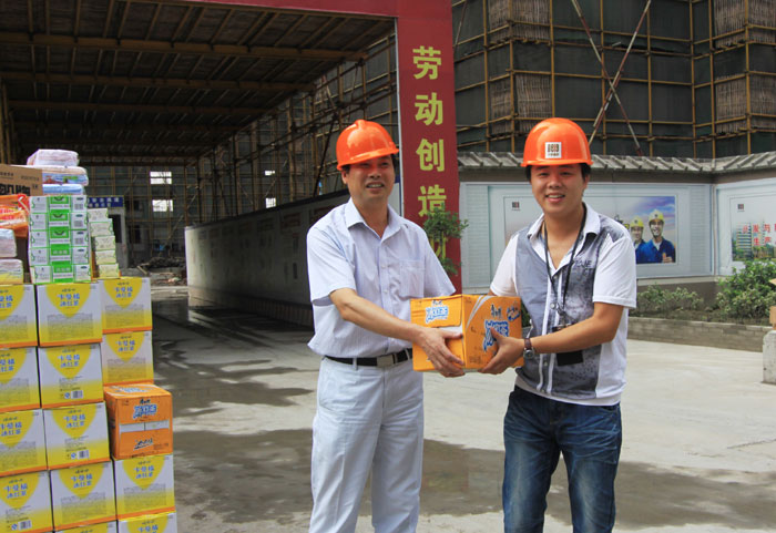 副总裁赵坤荣(左)给工程人员送上饮料