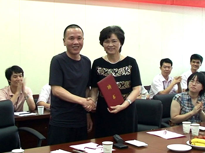 沈国健董事长(左)为李兰娟教授(右)颁发聘书