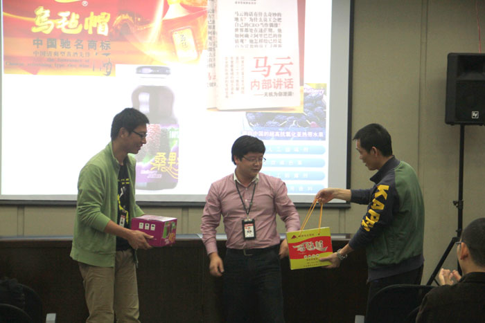 贝利电子副总经理岳俊(中)为优秀员工(左)赠送礼物