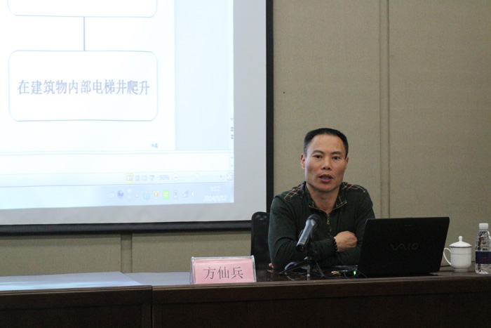 培训课上,方老师分别对塔式起重机和施工升降机两种设备的型号、分类、特点、基本组成等进行了介绍,就设备的安全使用、检查等要点进行了具体介绍,并例举了大量的施工现场案例。