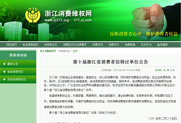 近日,浙江省第十届“消费者信得过单位”评选结果出炉,浙江贝利房地产集团有限公司榜上有名,荣获“消费者信得过单位”称号。据悉,贝利地产集团是余杭区唯一获此殊荣的房地产企业,同时也已连续多届获得该殊荣。