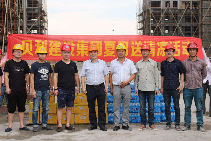 近日,贝利建设集团董事长寿明灿、总经理张妙伟等领导深入项目工地,慰问在高温时节奋战在一线的建筑工人,并送去了饮料、毛巾、藿香正气水等防暑降温用品,让一线员工在炎炎夏日感到丝丝“清凉”。
