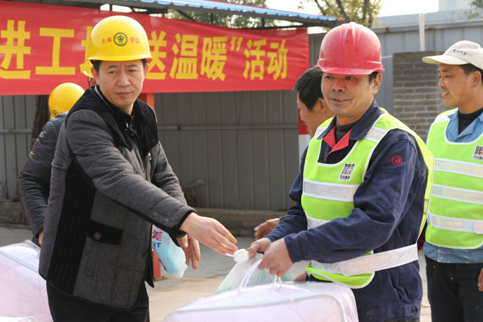 本次送温暖活动由区土木建筑学会理事长吴有民带队,秘书长沈卫星等十余人参加。慰问组一行向民工兄弟发放了冬被等御冬防寒用品,并实地察看了他们的工作、生活环境,与民工兄弟进行交流,对他们的辛勤劳动表示感谢,叮嘱民工兄弟在春节返乡途中注意安全。